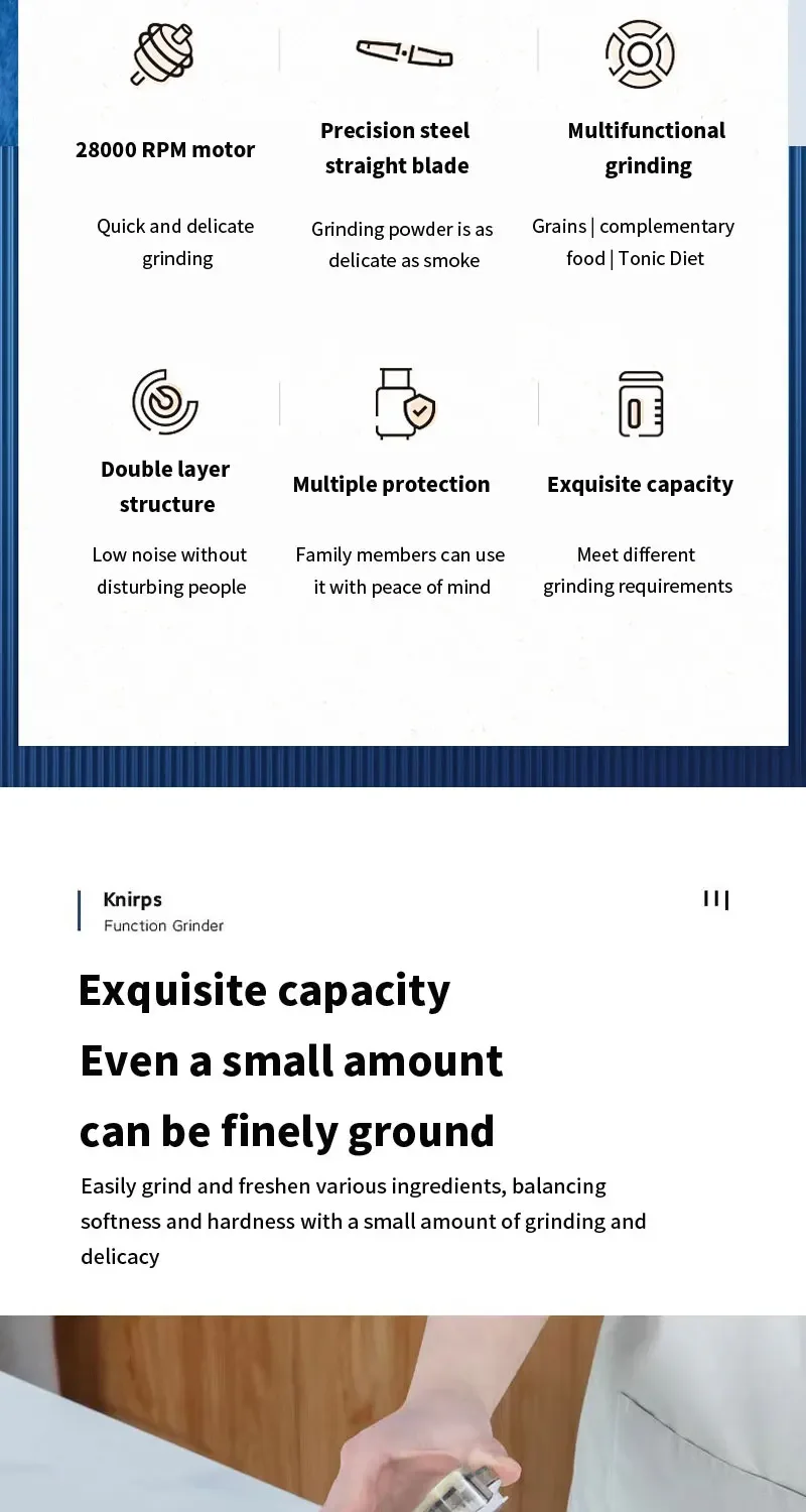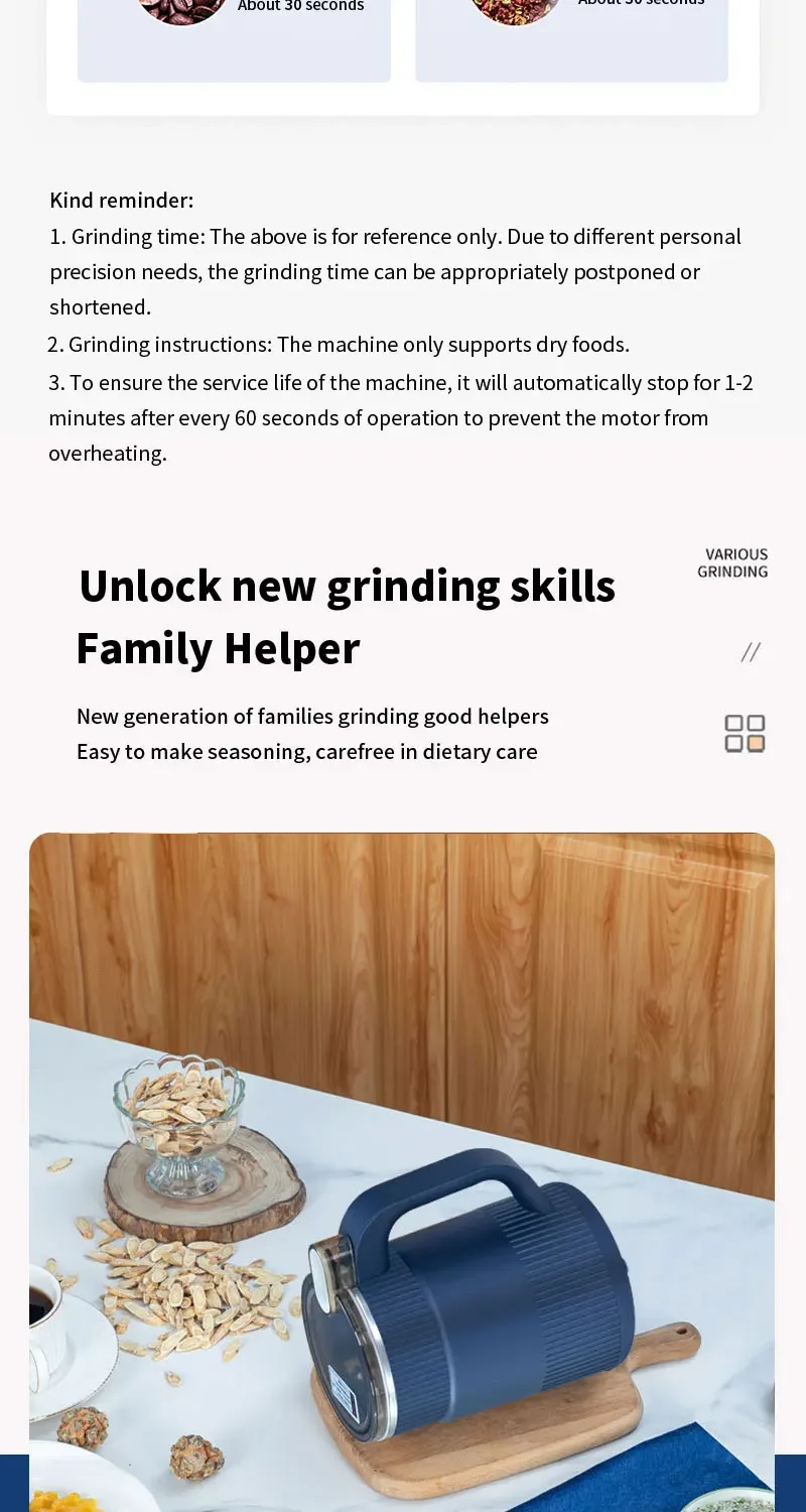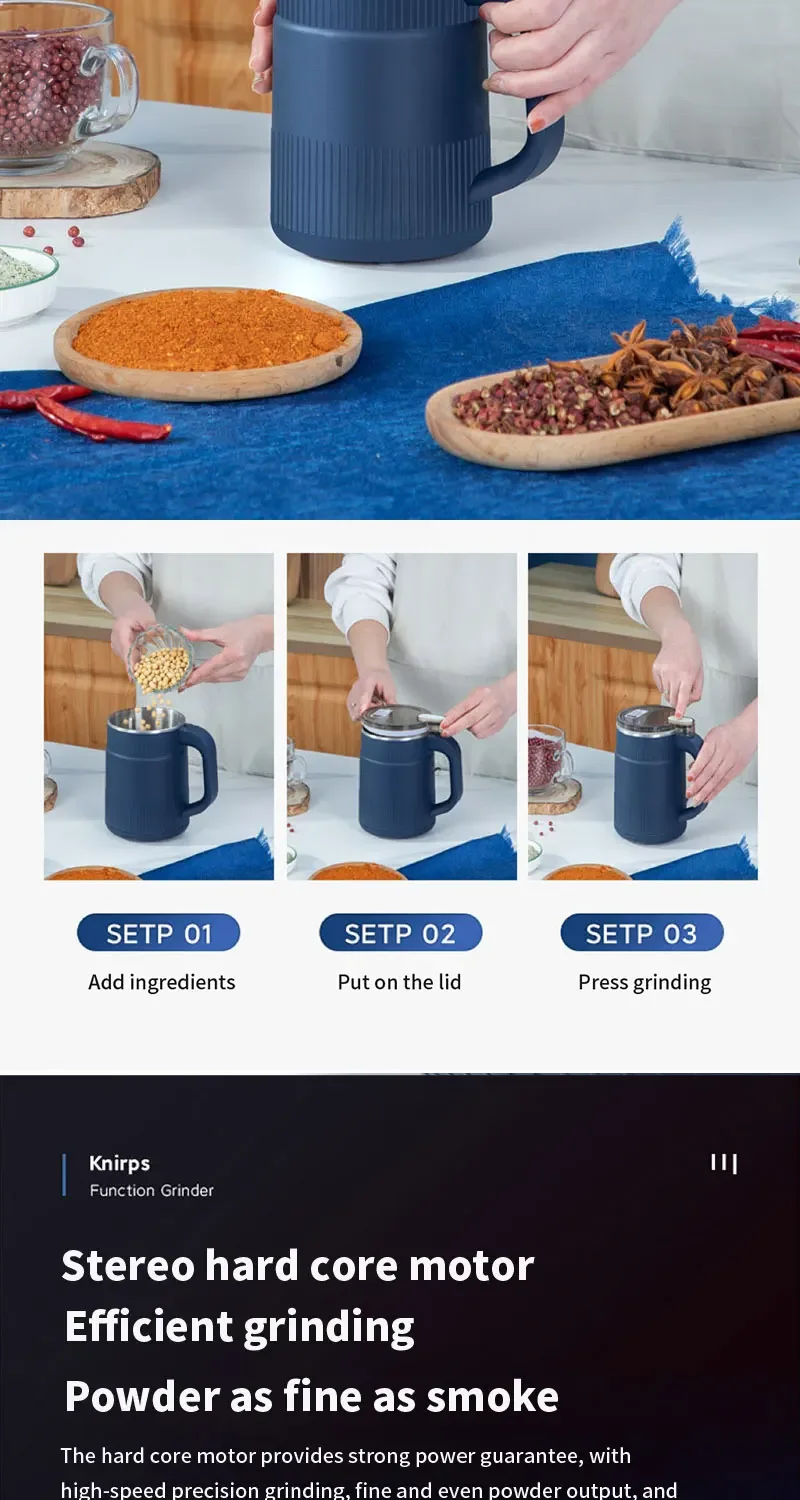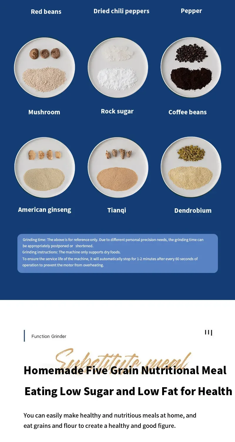 2. Multi functional: suitable for grinding grains, coffee beans, medicinal herbs, seasoning materials, etc.
